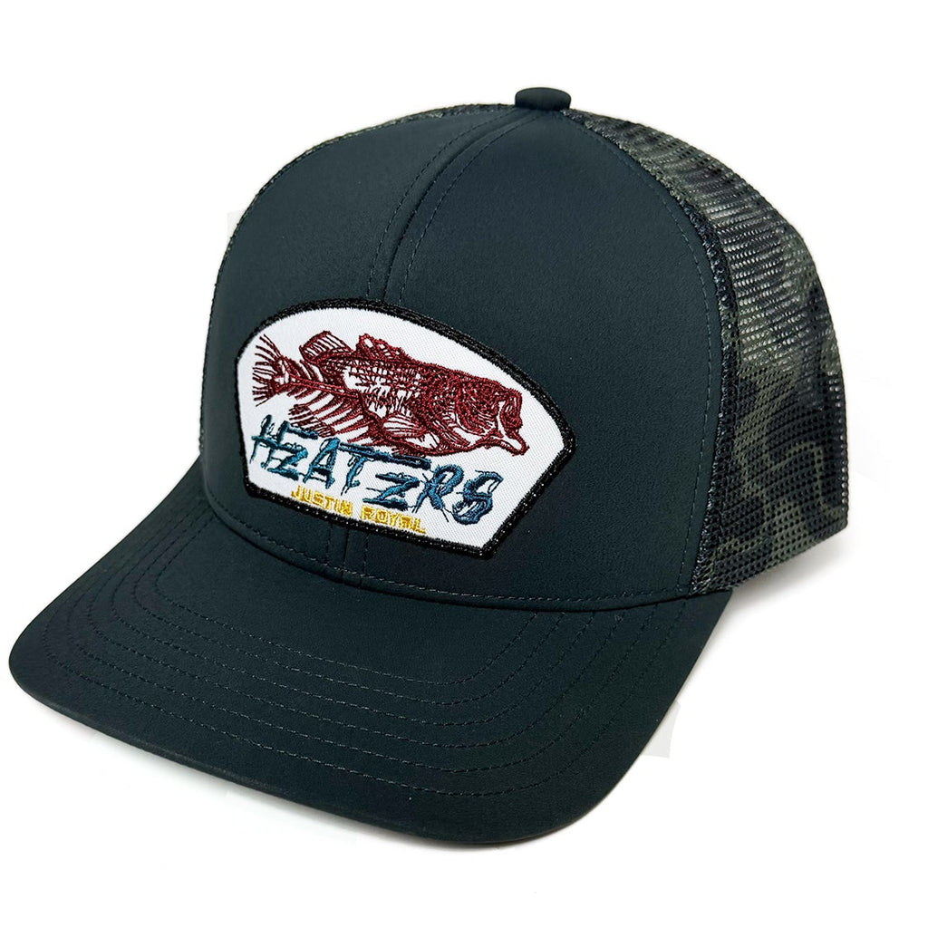 The "Heater Fish" gray & camo hat features a premium custom designed "Heater Fish" patch sewn onto a premium SoBro gray & camo mesh back with adjustable snap back curve bill style, ball cap.