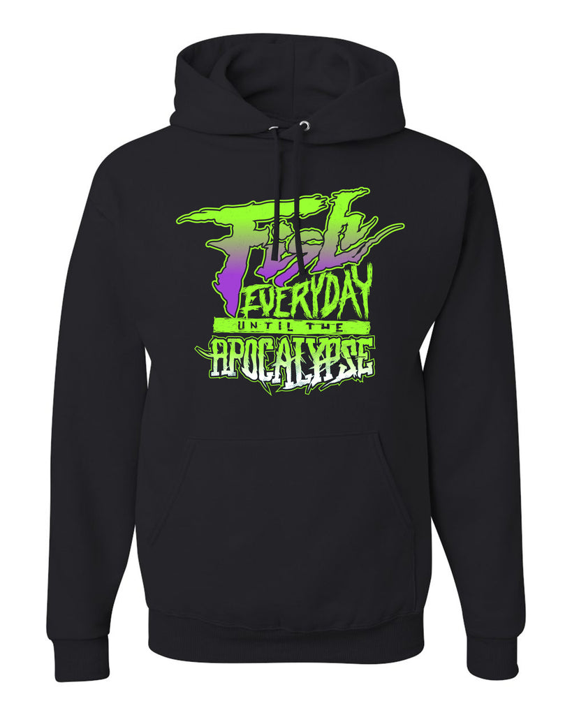 Garment / color = Black Hooded Sweatshirt with Vibrant Purple & Green "JOKER" FEDUTA Graphic, pullover